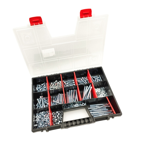 Dieses Set enthält ein komplettes Sortiment an M8-Innensechskantschrauben in verschiedenen Längen sowie unterschiedliche Muttern und Unterlegscheiben mit demselben Gewinde, sodass Sie jederzeit perfekt zueinander passende Elemente zur Hand haben. Darüber hinaus sind alle Teile in einem handlichen, tragbaren und robusten Organizer untergebracht, dessen Fächer frei angepasst und auch für anderes Werkzeug oder Zubehör genutzt werden können.