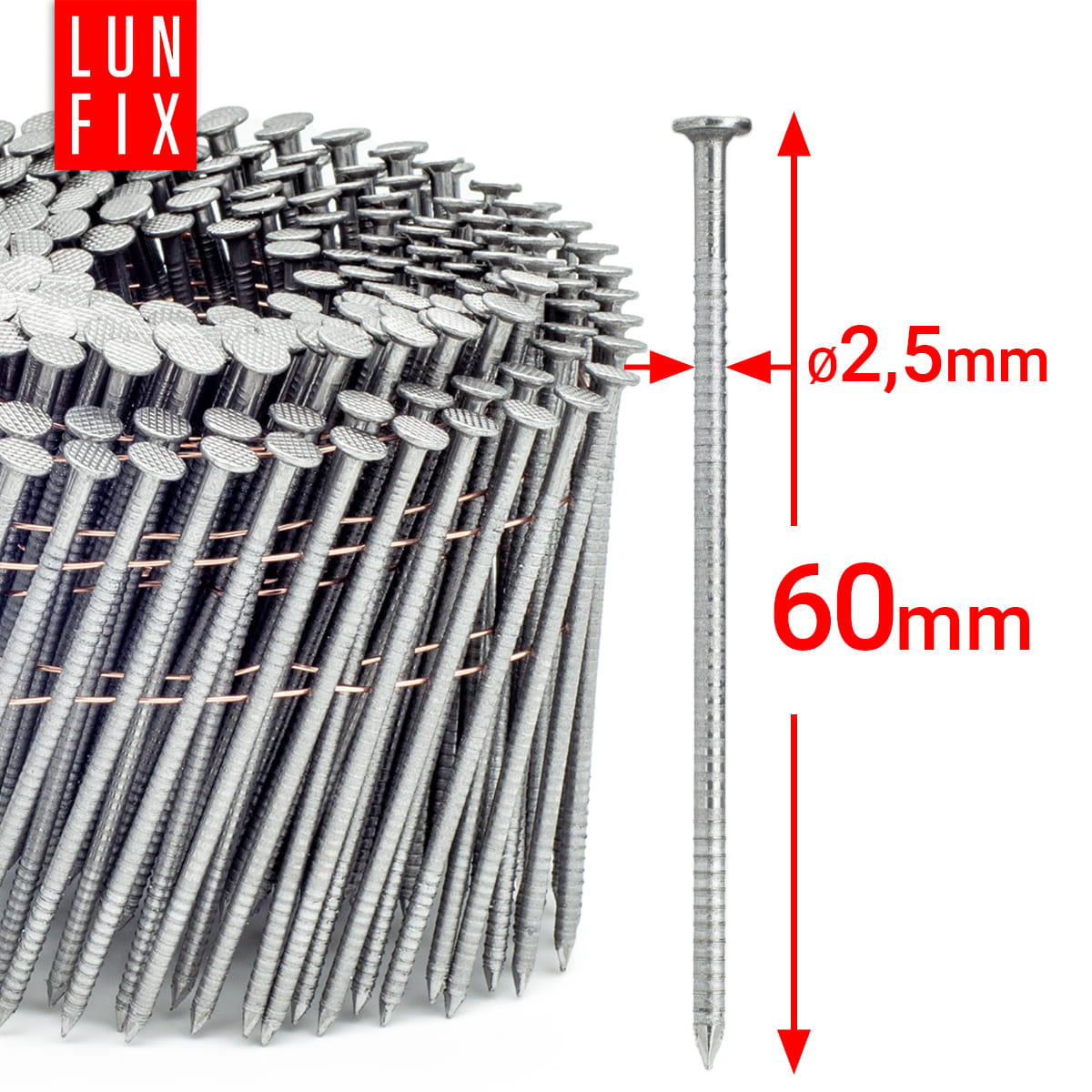 Das Sortiment der Lun Fix 16° Ring Drahtgebundenen Coilnägel stellt eine hochqualitative Befestigungslösung für die professionelle Bauindustrie dar. Diese Nägel sind speziell für die Verwendung mit Gasnaglern, Akku-Naglern und Druckluftnaglern konzipiert und bieten hervorragende Ergebnisse bei einer Vielzahl von Holz-zu-Holz-Verbindungen. Die Ringstruktur des Schaftes gewährleistet eine ausgezeichnete Haltekraft, was diese Nägel zur ersten Wahl für anspruchsvolle Befestigungsaufgaben macht. Ob für die Rahmenmontage, die Dachlattenbefestigung oder feine Tischlerarbeiten – die Ringschaftnägel von Lun Fix bieten eine zuverlässige Lösung. Jede Spule mit Coilnägeln ist sorgfältig verarbeitet, um die höchsten Standards zu erfüllen: •3,1 x 90 mm: Perfekt für tragende Konstruktionen, verfügbar in Packungen zu 3600 Stück. •3,4 x 120 mm: Ideal für Anwendungen, die eine größere Penetration und Haltekraft erfordern, mit 1800 Stück pro Packung. •2,5 x 50 mm: Mit ihrer kürzeren Länge eignen sich diese Nägel hervorragend für feinere Arbeiten, erhältlich in Packungen zu 9000 Stück. •2,5 x 60 mm: Diese Größe ist ein Allrounder für eine Vielzahl von Anwendungen, in Packungen zu 7200 Stück. •2,5 x 70 mm und 2,8 x 70 mm: Diese Nägel bieten zusätzliche Länge für stärkere Verbindungen, jeweils in Packungen zu 7200 und 6000 Stück. •2,8 x 80 mm: Entwickelt für Anwendungen, die eine tiefe Verankerung erfordern, mit 4500 Stück pro Packung. •2,1 x 35 mm: Diese kleinere Größe ist ideal für präzise Fixierungen und in hohen Stückzahlen von 14400 pro Packung verfügbar. •3,0 x 70 mm: Eine ausgezeichnete Wahl für allgemeine Bauarbeiten, verfügbar in Packungen zu 5400 Stück. Diese Nägel bieten eine optimale Leistung für Fachleute, die auf der Suche nach einer zuverlässigen, haltbaren Verbindung ohne zusätzliche Oberflächenbehandlung sind. Wählen Sie Lun Fix Nägel für Ihre Bauprojekte und profitieren Sie von der bewährten Qualität und Zuverlässigkeit, die die Marke Lun Fix seit Jahren kennzeichnet.