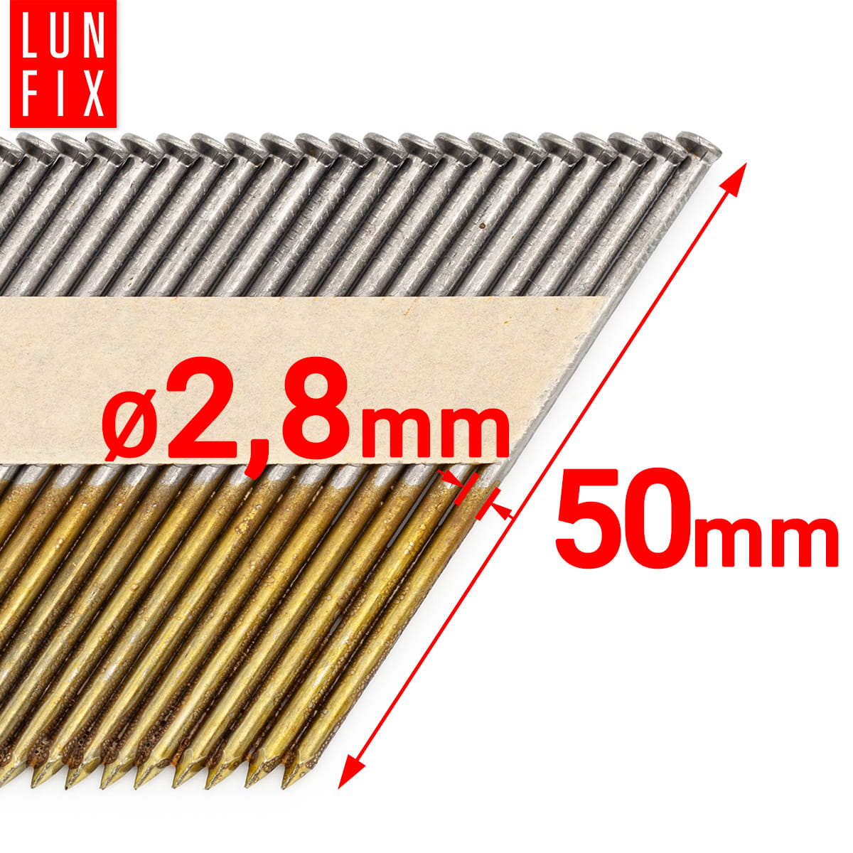 Die Lun Fix 34° Grad Glatt-Nägelserie ist eine ausgezeichnete Wahl für Profis, die mit Akku- und Gasnaglern sowie Druckluftnaglern arbeiten. Diese hochqualitativen Nägel sind in mehreren Größen und Packungsgrößen erhältlich, um eine Vielzahl von Anwendungen im Bauwesen zu unterstützen. • 2,8 x 50 mm: Diese Nadeln sind ideal für feine Befestigungsarbeiten, bei denen Präzision gefragt ist. Jede Packung enthält 4000 Stück unverzinkte, glatte D-Kopf-Nägel, die für eine reibungslose Verarbeitung und festen Sitz sorgen. • 2,8 x 70 mm: Mit einer etwas größeren Länge sind diese Nägel geeignet für Anwendungen, die eine tiefere Penetration und eine stärkere Haltekraft erfordern. Verfügbar in Packungen zu 3000 Stück, bieten sie die Flexibilität für anspruchsvolle Rahmenkonstruktionen. • 3,1 x 90 mm: Diese Nägel sind mit 2000 Stück pro Packung erhältlich und bieten sowohl in der unverzinkten als auch in der extra verzinkten Variante eine zuverlässige Leistung für schwerere Konstruktionsaufgaben. • 3,3 x 100 mm: Die größten in dieser Reihe, diese extra verzinkten Nägel, bieten erhöhte Widerstandsfähigkeit gegen Witterungseinflüsse. Die Packung enthält 2000 Stück, ideal für Außenanwendungen, bei denen Langlebigkeit entscheidend ist. Die Papierbindung der Nägel sorgt für eine saubere und einfache Anwendung, wobei die Nägel leicht von der Streifenverbindung gelöst werden können, ohne zu verbiegen. Die glatte Schaftrückenoberfläche gewährleistet ein schnelles Eindringen ins Holz und eine feste Verankerung. Die extra verzinkten Varianten der 3,1 x 90 mm und 3,3 x 100 mm Nägel sind speziell für Projekte entwickelt, bei denen Korrosionsschutz unerlässlich ist, und erweitern somit das Einsatzspektrum von Lun Fix-Nägeln auf Anwendungen in feuchter oder korrosiver Umgebung. Für Bauunternehmer, Tischler und Zimmerleute, die auf Qualität, Effizienz und Vielseitigkeit setzen, sind die 34° Grad D-Kopf-Nägel von Lun Fix eine exzellente Wahl.