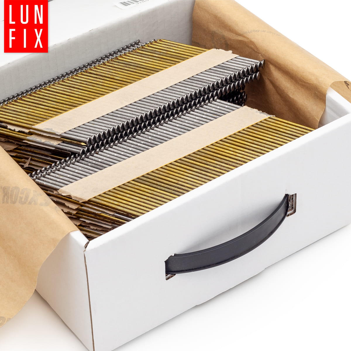 Die Lun Fix 34° Grad Glatt-Nägelserie ist eine ausgezeichnete Wahl für Profis, die mit Akku- und Gasnaglern sowie Druckluftnaglern arbeiten. Diese hochqualitativen Nägel sind in mehreren Größen und Packungsgrößen erhältlich, um eine Vielzahl von Anwendungen im Bauwesen zu unterstützen. • 2,8 x 50 mm: Diese Nadeln sind ideal für feine Befestigungsarbeiten, bei denen Präzision gefragt ist. Jede Packung enthält 4000 Stück unverzinkte, glatte D-Kopf-Nägel, die für eine reibungslose Verarbeitung und festen Sitz sorgen. • 2,8 x 70 mm: Mit einer etwas größeren Länge sind diese Nägel geeignet für Anwendungen, die eine tiefere Penetration und eine stärkere Haltekraft erfordern. Verfügbar in Packungen zu 3000 Stück, bieten sie die Flexibilität für anspruchsvolle Rahmenkonstruktionen. • 3,1 x 90 mm: Diese Nägel sind mit 2000 Stück pro Packung erhältlich und bieten sowohl in der unverzinkten als auch in der extra verzinkten Variante eine zuverlässige Leistung für schwerere Konstruktionsaufgaben. • 3,3 x 100 mm: Die größten in dieser Reihe, diese extra verzinkten Nägel, bieten erhöhte Widerstandsfähigkeit gegen Witterungseinflüsse. Die Packung enthält 2000 Stück, ideal für Außenanwendungen, bei denen Langlebigkeit entscheidend ist. Die Papierbindung der Nägel sorgt für eine saubere und einfache Anwendung, wobei die Nägel leicht von der Streifenverbindung gelöst werden können, ohne zu verbiegen. Die glatte Schaftrückenoberfläche gewährleistet ein schnelles Eindringen ins Holz und eine feste Verankerung. Die extra verzinkten Varianten der 3,1 x 90 mm und 3,3 x 100 mm Nägel sind speziell für Projekte entwickelt, bei denen Korrosionsschutz unerlässlich ist, und erweitern somit das Einsatzspektrum von Lun Fix-Nägeln auf Anwendungen in feuchter oder korrosiver Umgebung. Für Bauunternehmer, Tischler und Zimmerleute, die auf Qualität, Effizienz und Vielseitigkeit setzen, sind die 34° Grad D-Kopf-Nägel von Lun Fix eine exzellente Wahl.