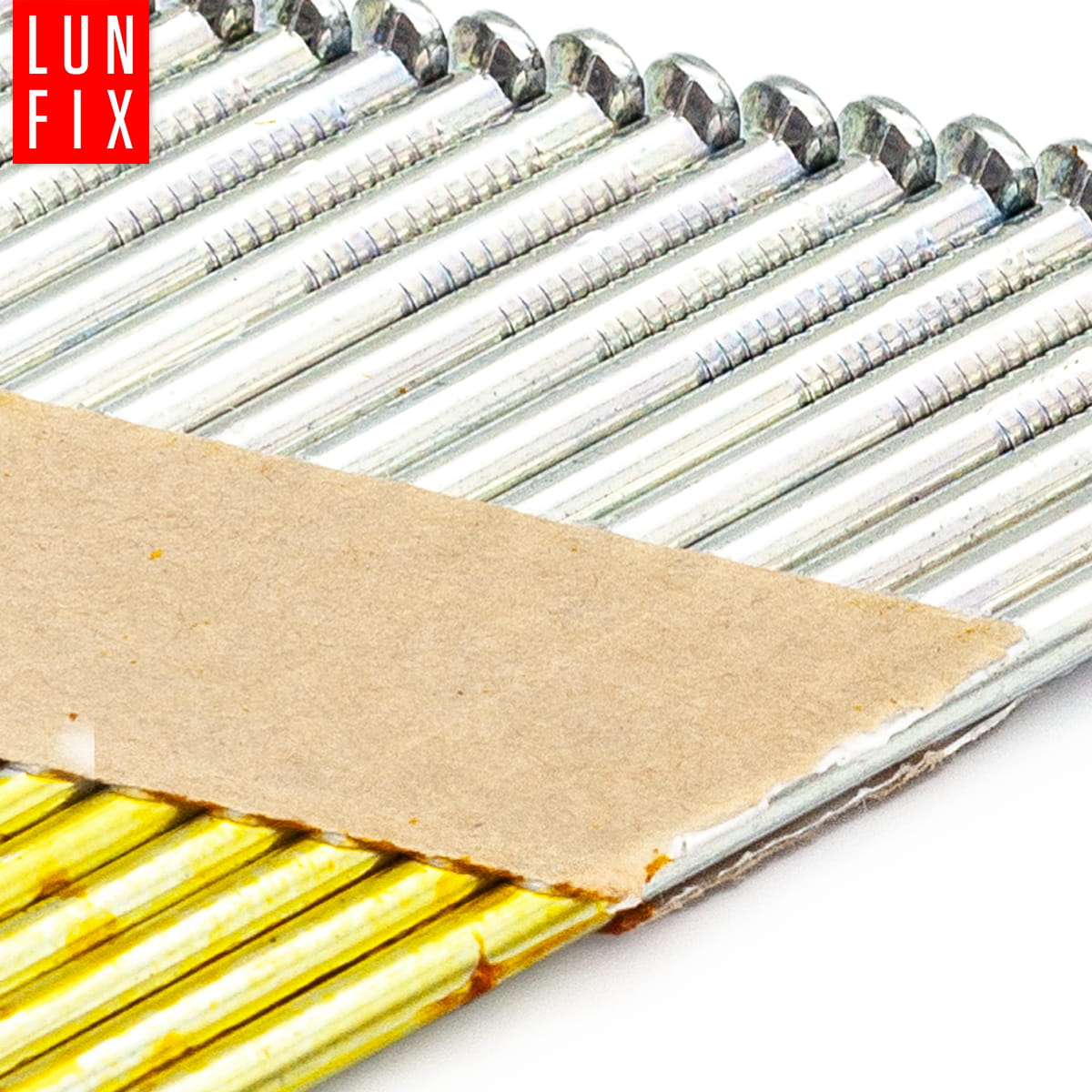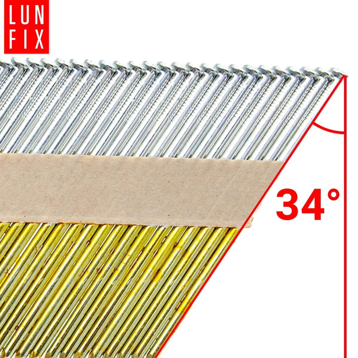 Die Lun Fix 34° Grad Glatt-Nägelserie ist eine ausgezeichnete Wahl für Profis, die mit Akku- und Gasnaglern sowie Druckluftnaglern arbeiten. Diese hochqualitativen Nägel sind in mehreren Größen und Packungsgrößen erhältlich, um eine Vielzahl von Anwendungen im Bauwesen zu unterstützen. • 2,8 x 50 mm: Diese Nadeln sind ideal für feine Befestigungsarbeiten, bei denen Präzision gefragt ist. Jede Packung enthält 4000 Stück unverzinkte, glatte D-Kopf-Nägel, die für eine reibungslose Verarbeitung und festen Sitz sorgen. • 2,8 x 70 mm: Mit einer etwas größeren Länge sind diese Nägel geeignet für Anwendungen, die eine tiefere Penetration und eine stärkere Haltekraft erfordern. Verfügbar in Packungen zu 3000 Stück, bieten sie die Flexibilität für anspruchsvolle Rahmenkonstruktionen. • 3,1 x 90 mm: Diese Nägel sind mit 2000 Stück pro Packung erhältlich und bieten sowohl in der unverzinkten als auch in der extra verzinkten Variante eine zuverlässige Leistung für schwerere Konstruktionsaufgaben. • 3,3 x 100 mm: Die größten in dieser Reihe, diese extra verzinkten Nägel, bieten erhöhte Widerstandsfähigkeit gegen Witterungseinflüsse. Die Packung enthält 2000 Stück, ideal für Außenanwendungen, bei denen Langlebigkeit entscheidend ist. Die Papierbindung der Nägel sorgt für eine saubere und einfache Anwendung, wobei die Nägel leicht von der Streifenverbindung gelöst werden können, ohne zu verbiegen. Die glatte Schaftrückenoberfläche gewährleistet ein schnelles Eindringen ins Holz und eine feste Verankerung. Die extra verzinkten Varianten der 3,1 x 90 mm und 3,3 x 100 mm Nägel sind speziell für Projekte entwickelt, bei denen Korrosionsschutz unerlässlich ist, und erweitern somit das Einsatzspektrum von Lun Fix-Nägeln auf Anwendungen in feuchter oder korrosiver Umgebung. Für Bauunternehmer, Tischler und Zimmerleute, die auf Qualität, Effizienz und Vielseitigkeit setzen, sind die 34° Grad D-Kopf-Nägel von Lun Fix eine exzellente Wahl.