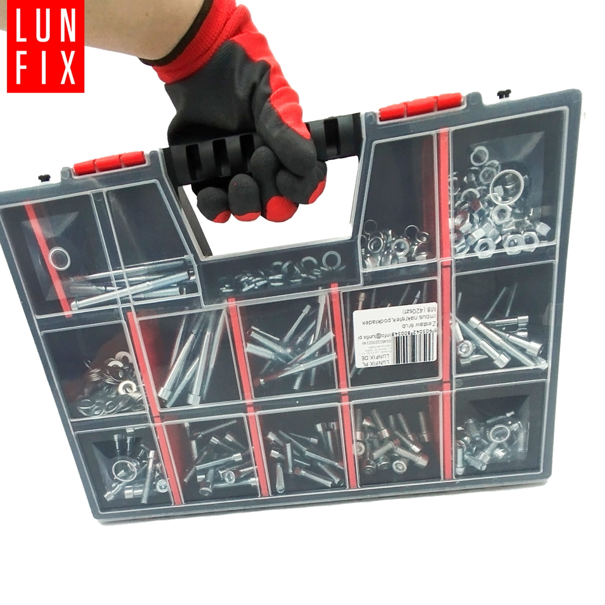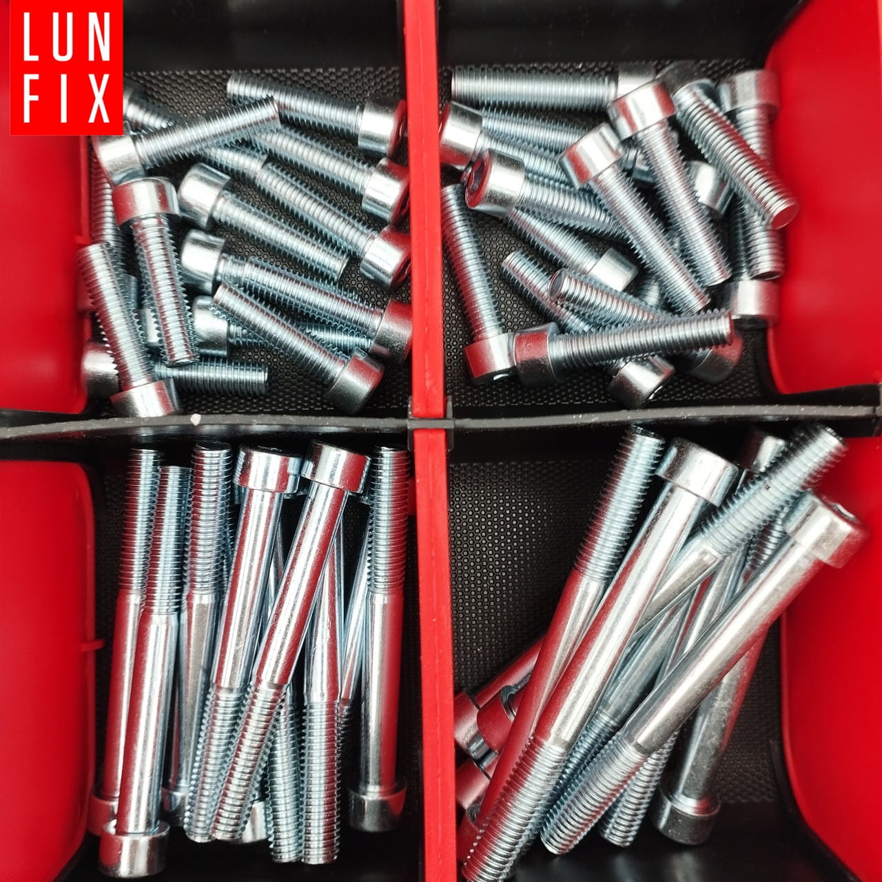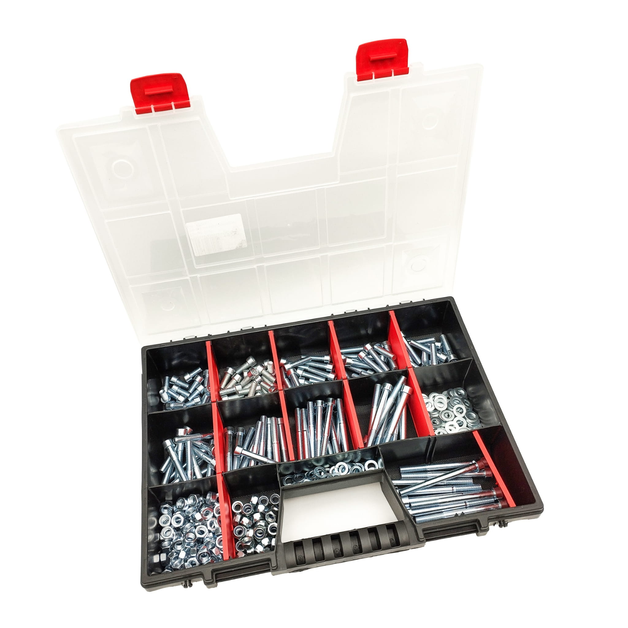 Dieses Set enthält ein komplettes Sortiment an M8-Innensechskantschrauben in verschiedenen Längen sowie verschiedene Muttern und Unterlegscheiben mit derselben Gewindegröße, sodass du immer perfekt passende Verbindungselemente zur Hand hast. Aber das ist noch nicht alles. Wir haben die Elemente in eine praktische, tragbare und robuste Aufbewahrungsbox verpackt, die du dank ihrer anpassbaren Fächer auch für andere Werkzeuge und Zubehör verwenden kannst.